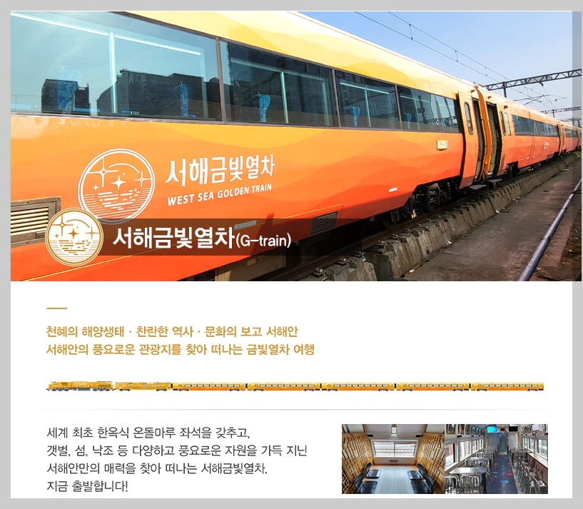 서해금빛열차는 서울 용산역에서 출발하는 관광 전용 열차로 세계 최초로 한옥식 온돌방이 내부에 마련되어 있습니다.