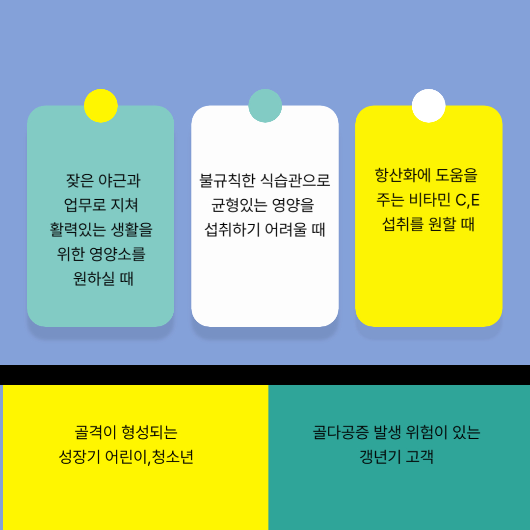 1일 1팩(1 캡슐, 2정)씩 간편하게 섭취할 수 있게 60팩(2개월분) 들이 포장으로 구성돼 있고 1팩에는 비타민C가 식약처 1일 영양성분 기준치 대비 1000%인 1000mg, 비타민D는 500%인 2000IU가 함유돼 있습니다.
