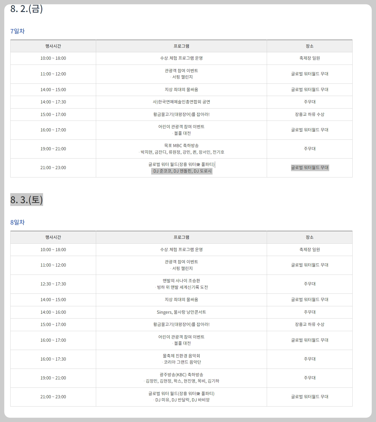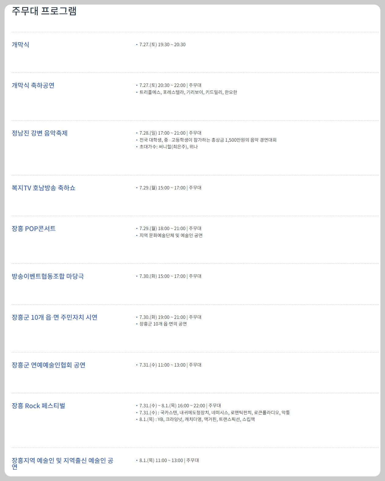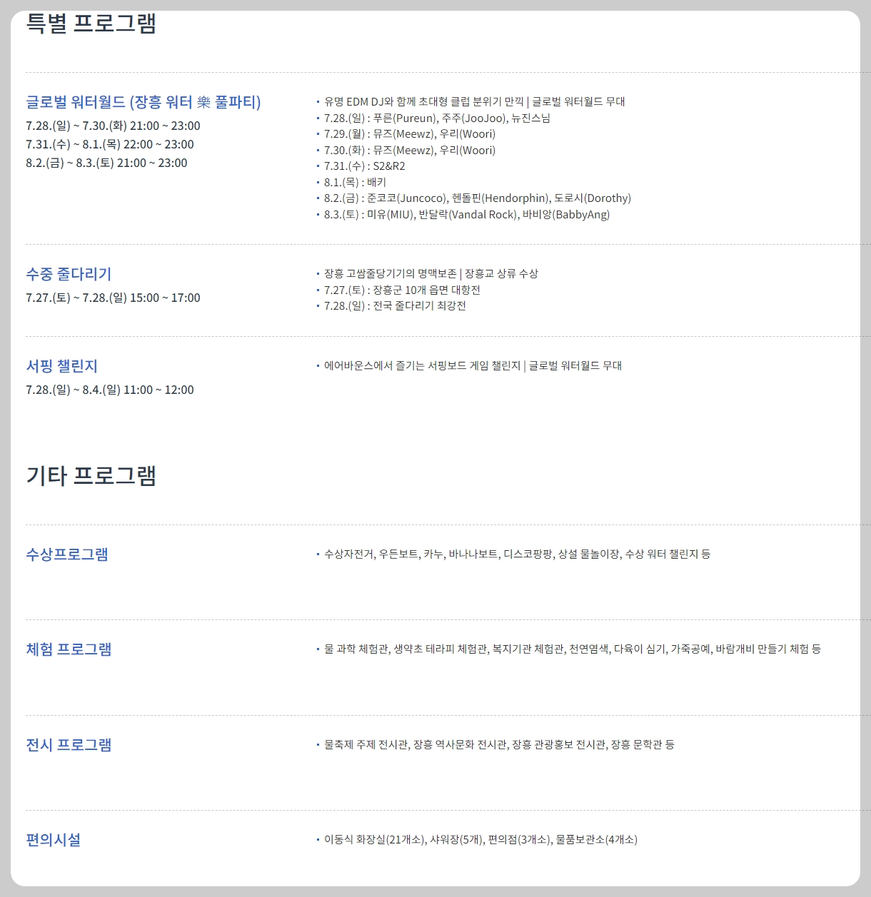 장흥 물축제의 자세한 내용과 라인업은 아래를 참고해 주세요.