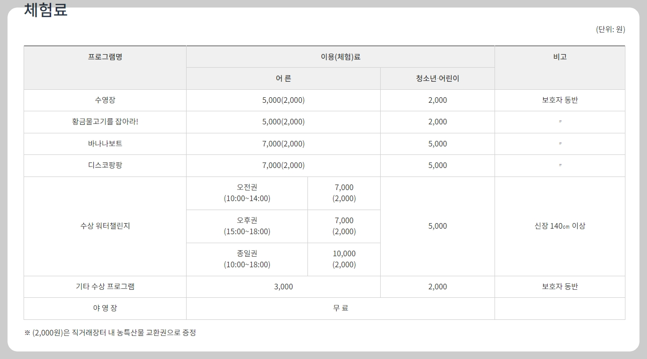 - 수상프로그램-우든보트/수상자전거/카누 타기/바나나보트/카누 타기/바나나보트/디스코팡팡/야외풀장운영-평여울 징검다리 이용/수상 워터 챌린지