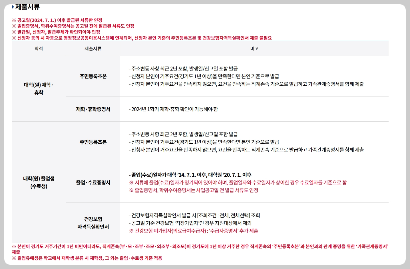 - 본인뿐만 아니라 가족 중 경기도 1년 이상 거주하고 있다면 지원 가능(2023.07.01~2024.07.01)